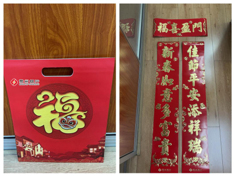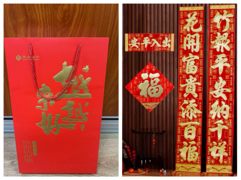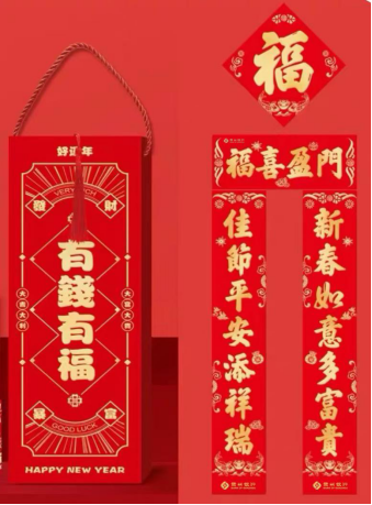 1.1.5米普通包装款:对联尺寸25*150cm、福字尺寸40*40cm、手提袋尺寸35*42cm;对联材质150克铜板纸、手提袋材质250克白色卡纸;对联工艺文字满底烫金、手提袋工艺四色印刷复亚膜。
