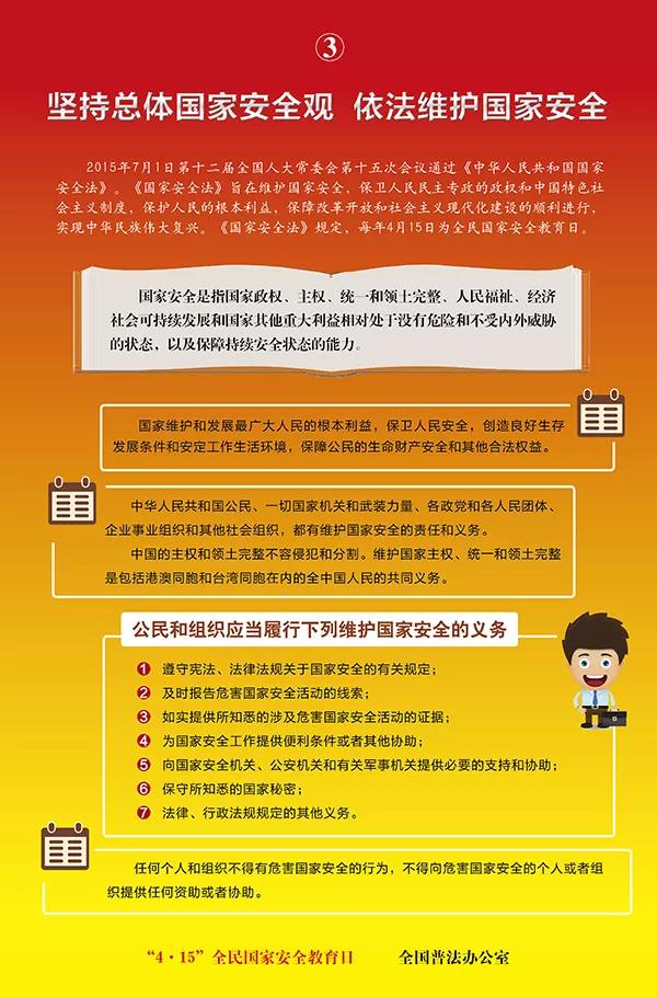 2015年7月1日,第十二届全国人民代表大会常务委员会第十五次会议通过了《中华人民共和国国家安全法》,该法自公布之日起施行。国家安全法第14条规定:每年4月15日为全民国家安全教育日。今年的4月15日,为第三个全民国家安全教育日。