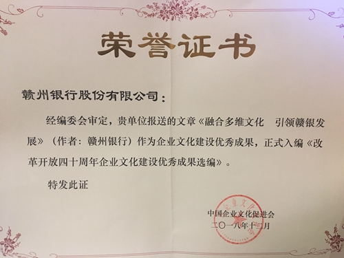 党的十九大报告指出,没有高度的文化自信,没有文化的繁荣发展,就没有中华民族的伟大复兴。城市商业银行是我国金融市场的重要主体,城市商业银行企业文化也是金融行业企业文化乃至社会主义先进文化的重要组成部分。赣州银行虽然地处欠发达、后发展的赣南革命老区,在企业文化建设上一度处于“劣势”,但赣州银行坚定依托城市文化的比较优势,全方位培育了以市场文化、品牌文化、职业文化、经营文化、服务文化为支撑的具有独特气质的多维文化体系,将企业文化渗透到经营发展的每一个细胞,走出了一条多维的企业文化建设路径,全面提升了企业竞争力。2015年、2016年、2017年、2018年,赣州银行分别荣获中国企业文化促进会颁发的“企业文化创新优秀单位”、“品牌文化优秀企业”称号。