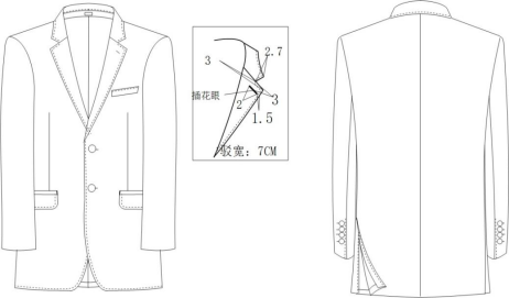 男西服款式描述:二粒扣平驳领西服,下摆圆角,左胸手巾袋,大袋双开线有袋盖,后双开叉,袖勾角开叉锁假眼,袖口订四粒看扣。内嵌边、拱针工艺,肩肘部采用弹力里布增加舒适度。详见下图: