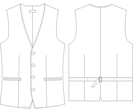 男马甲款式描述:四粒扣,前收省到底,前双开线袋,后背采用大身面料制作,后中缝三角开叉。内嵌边、拱针工艺。详见下图: