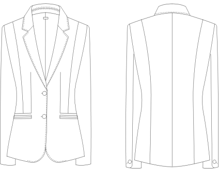 女西服款式描述:二粒扣平驳领西服,前收省加直分割至侧缝,大袋双开线袋,后直分割,后不开叉,袖口真开叉并订扣1颗。内嵌边、拱针工艺,肩肘部采用弹力里布,增加舒适度。详见下图: