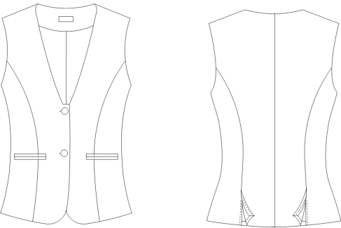 女马甲款式描述:二粒扣,V领,前后公主线,双开线袋,后双开叉,内嵌边、拱针工艺。详见下图: