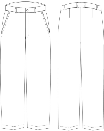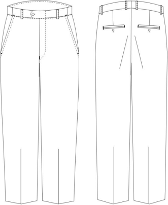 冬裤:前无褶裤,后单省,前斜插袋,后单开线袋并订扣1颗,直角腰头并订扣1颗,裤腰6根串带,内腰为松紧。