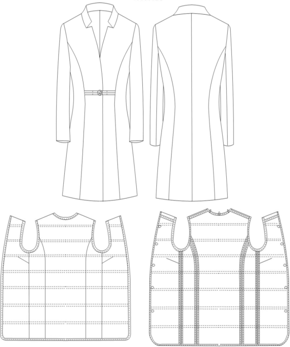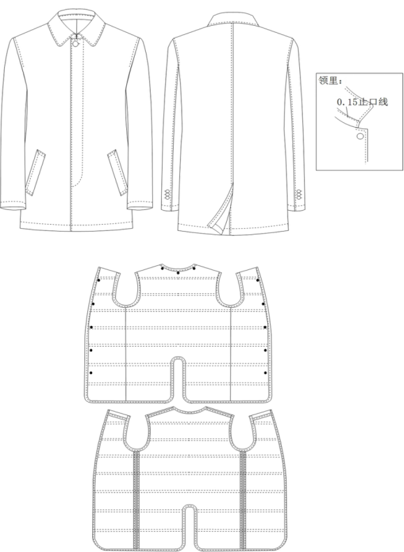 女大衣款式描述:女大衣,立领,中腰盘扣,前后公主分割,后不开叉,可脱卸背心式鹅绒内胆(95鹅绒,充绒量27克)。详见下图: