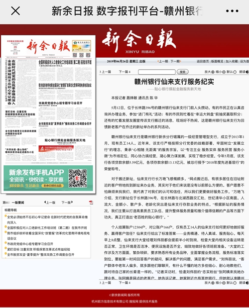 《新余日报》头版刊发新余分行成立十周年行庆系列宣传报道