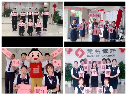 喜迎分行十周年,大家拍摄祝福的抖音视频表达对分行的祝福,作为赣银的一员,作为赣银新余分行的一员,骄傲!自豪!